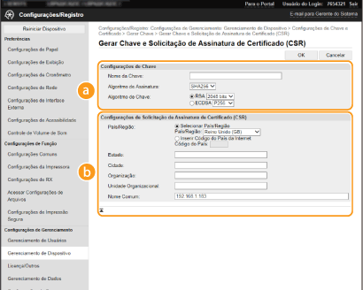 Visto que os certificados gerados na máquina não têm uma assinatura da CA, é possível que ocorra um erro de comunicação consoante os dispositivos que comuniquem com a máquina. Para a autoridade de certificação emitir o certificado com a assinatura da CA, é necessário obter dados de CSR (solicitação de assinatura de certificado), que o administrador pode gerar a partir da UI Remota. Quando o certificado for emitido, registe-o na chave com a CSR gerada.