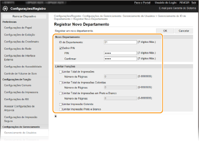 Registe uma ID de departamento e defina um PIN para a ID. Registe todas as ID de departamento destinadas a gestão.