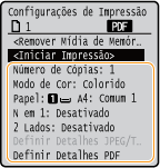 Se <Tela quando mídia memória está conectada> está definido para <Ativado>, o ecrã para saber se pretende iniciar a impressão a partir de dispositivo de memória é exibido quando insere um dispositivo de memória USB enquanto é exibido o ecrã Início. Ao selecionar <Imp. Mídia Memória> é apresentado o ecrã de Impressão Multimédia de Memória.