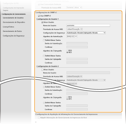 O SNMP (Simple Network Management Protocol) é um protocolo utilizado para monitorizar e controlar dispositivos de comunicação numa rede utilizando MIB (Management Information Base). A máquina é compatível com SNMPv1 e SNMPv3 com reforço de segurança. Pode verificar o estado da máquina a partir de um computador quando imprimir documentos ou utilizar a UI Remota. Pode ativar SNMPv1 ou SNMPv3 individualmente, ou ambos ao mesmo tempo. Especifique as definições de cada versão consoante o ambiente de rede e a finalidade de utilização.