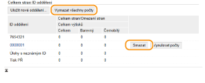 Chcete-li nastavit počet opět na nulu, klikněte na příslušný textový odkaz pod [ID oddělení] a klikněte na [Vynulovat počty]  [OK]. Chcete-li nastavit počet na nulu pro všechna ID oddělení, klikněte na [Vymazat všechny počty]  [OK].