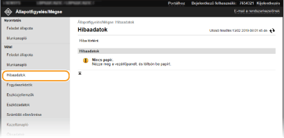 Ha hiba történik, akkor a Portál oldalon (főoldalon) a [Hibaadatok] alatti üzenetre kattintva ez az oldal jelenik meg. A Távoli felhasználói felület képernyője