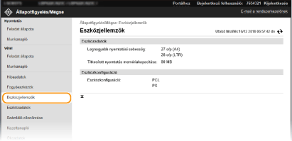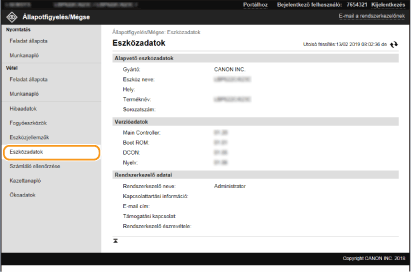 A készülékkel és a rendszerkezelővel kapcsolatos információk jelennek meg. Az itt megjelenő eszköznév, illetve a többi rendszerkezelői információ a [Felhasználókezelés] lap [Rendszerkezelő adatai] beállításában, vagy az [Eszközkezelés] lap [Eszközinformációs beállítások] beállításában megadott értékeknek felel meg.