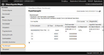 Itt megtekintheti a festékkazetta-naplókat, valamint a többi típusú naplót. Azt is beállíthatja, hogy a festékkazetta melyik színére vonatkozóan jelenjenek meg az adatok.
