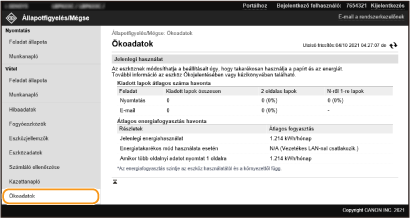 Megjelenik a nyomatok havi összesített száma és a havi összesített energiafelvétel. Megjelenítheti az Eco Information képernyőt, és módosíthatja a beállításokat, hogy papírt és energiát takaríthasson meg.