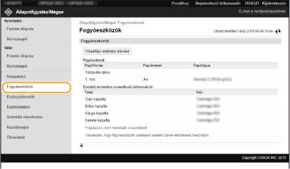 Megjelenik a papírforráshoz tartozó papírtípus és papírméret, valamint a festékkazetta típusszáma stb. A Portál oldalon (főoldalon) található [Fogyóeszköz-adatok ellenőrzése] gombra kattintva is megjelenítheti ezt az oldalt (A Távoli felhasználói felület képernyője).