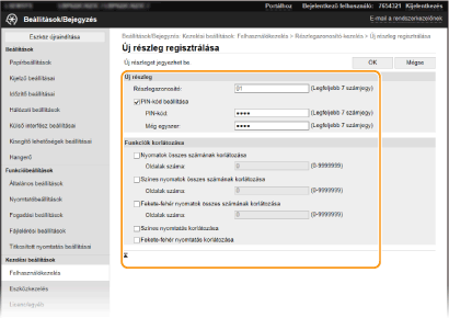 [Funkciók korlátozása] A regisztrálni kívánt részlegek számára korlátozhatja a nyomtatható oldalak számát, valamint az elérhető funkciókat. A nyomtatható oldalak számának korlátozásához válassza ki a jelölőnégyzetet a kívánt típushoz, majd adja meg a számot az [Oldalak száma] mezőben. Jelölje be a korlátozni kívánt funkciókhoz tartozó jelölőnégyzetet.