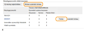 Ha szeretné nullázni egy azonosító nyilvántartását, akkor a [Részlegazonosító] alatt kattintson a megfelelő szöveges hivatkozásra, majd kattintson a [Számláló törlése]  [OK] lehetőségre. Ha minden részlegazonosító nyilvántartását nullázni szeretné, akkor a [Minden számláló törlése]  [OK] lehetőségre kattintson.