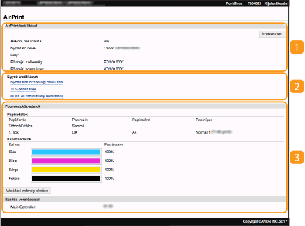 Ha rendszergazdai jogosultsággal jelentkezik be, az AirPrint-kompatibilis oldal az alábbi módon jelenik meg.