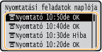Válassza ki azt a dokumentumot, amelynek a naplóját ellenőrizni kívánja.Ha a dokumentum nyomtatása sikeres volt, akkor az <OK> felirat jelenik meg, ha viszont megszakítás vagy valamilyen hiba miatt sikertelen volt, akkor a <Hiba> jelzés látható.