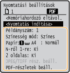Ha a <Képernyő csatlakozt. mem. hord. esetén> értéke <Be>, a képernyő a memória adathordozó nyomtatásának megkezdéséről akkor jelenik meg, ha USB-memóriaeszközt helyez be, miközben a Főképernyő megjelenik. A <Mem.hord.-nyomtatás> megjeleníti a memóriaeszközökről való nyomtatás képernyőjét.