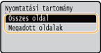 <Megadott oldalak> A kinyomtatni kívánt oldaltartomány kiválasztása. Adja meg az <Első oldal> és az <Utolsó oldal> kívánt értékét a számbillentyűkkel, majd válassza az <Alkalmaz> lehetőséget.