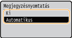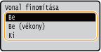 A <Be> lehetőség kiválasztásával festéktakarékos módban nyomtathat. Ha egy nagyobb munka kinyomtatása előtt szeretné ellenőrizni az elrendezést és az egyéb jellemzőket, állítsa ezt a beállítást a <Be> lehetőségre. A beállítás leírását lásd: