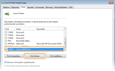 Nem törölhet olyan portot, amelyik jelenleg a nyomtatóportként van konfigurálva. A port törléséhez válasszon ki egy másik portot, majd kattintson az [Alkalmaz] lehetőségre az új nyomtatóportként való konfigurálásához, majd törölje az eredeti portot.