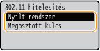Ha a készülék vezeték nélküli hálózathoz csatlakozik, és a vezeték nélküli útválasztón megosztott kulcsos hitelesítés van beállítva, akkor a készülék hitelesítési hibát észlel. Ilyenkor a készülék automatikusan a <Megosztott kulcs> beállításra vált, és ismét megpróbálkozik a csatlakozással.