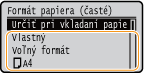 Po uložení nastavenia predvoleného papiera sa pri vložení papiera nezobrazí okno nastavenia papiera a vždy sa použije rovnaké nastavenie. Ak vložíte papier inej veľkosti alebo typu bez zmeny nastavení papiera, zariadenie nemusí tlačiť správne. Aby ste zabránili tomuto problému, vyberte v kroku 3 položku <Určiť pri vklad. papiera> a potom vložte papier.