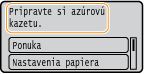 Môžete nastaviť ľubovoľnú hodnotu ako percentuálnu hodnotu zostávajúceho množstva tonera v kazete s tonerom, ktoré zobrazenie správy iniciuje. <Zobraziť čas. upozor. na prípravu kazety>
