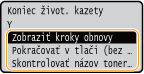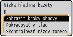 Ak sa správa zobrazí pre kazetu s čiernym tonerom počas prijímania dokumentu I-Fax, zariadenie nevykoná tlač, aby sa zabránilo nejasnej tlači. Ak chcete pokračovať v tlači, aj keď je množstvo zostávajúceho tonera v kazete s tonerom nízke, nastavte položku <Pokr. v tlači pri nízk. hladine v kazete> na možnosť <Zap.>. <Pokr. v tlači pri nízk. hladine v kazete>