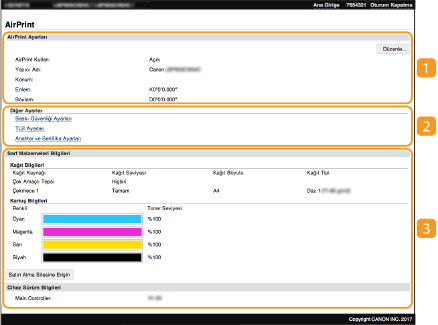 Makinenin adı ve kurulum yeri de dahil olmak üzere, makineyi tanımlamak için kullanılan bilgileri kaydedebilirsiniz. Makinenin AirPrint işlevini devre dışı da bırakabilirsiniz. Bu ayarları değiştirmek için Uzak Kullanıcı Arabirimini kullanın.