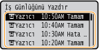Günlüğünü denetlemek istediğiniz belgeyi seçin.<Tamam>, bir belge başarıyla yazdırıldığında görüntülenir ve <Hata>, bir belge iptal edildiği veya hata oluştuğu için belge yazdırılamadığında görüntülenir.