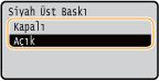 A4 ve Letter boyutunda kağıtlardan biri yüklenmiş, ancak diğeri yüklenmemişse, A4 ve Letter boyutunda kağıda yazdırma arasında geçiş yapılıp yapılmayacağını seçin. <Açık> öğesini seçip bilgisayardan yazdırmak için A4 boyutunda kağıt belirtirseniz, ancak A4 boyutunda kağıt makinede yüklü değilse, makine belgenizi Letter boyutunda kağıda yazdırır.