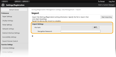 يمكن حفظ بيانات إعدادات الجهاز في الكمبيوتر (تصدير). ويمكن أيضًا تسجيل البيانات التي يتم حفظها على الكمبيوتر في الجهاز (استيراد). ويمكن استيراد البيانات التي يتم تصديرها من هذا الجهاز إلى جهاز آخر من نفس الطراز. ويمكنك بسهولة نسخ مجموعة متنوعة من بيانات الإعدادات إلى أجهزة متعددة. لاستخدام هذه الميزات، يلزم القيام بتسجيل الدخول في وضع مدير النظام.