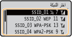 يمكنك البحث عن الموجهات اللاسلكية (أو نقاط الوصول) المتاحة للاتصال وتحديد أحدها من شاشة الجهاز. فيما يتعلق بمفتاح الشبكة، أدخل مفتاح WEP أو PSK. قبل تحديد موجه لاسلكي، تحقق من معلومات الإعداد المطلوبة وقم بتدوينها، بما في ذلك مفتاح SSID ومفتاح الشبكة (
