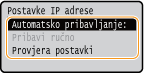 Odaberite da biste postavke IP adrese konfigurirali ručno unošenjem IP adrese. Da biste odabrali tu mogućnost, automatsko pribavljanje mora biti postavljeno na <Isključ.>.