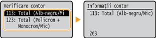 Puteţi verifica separat numărul total de pagini utilizate pentru documentele imprimate color şi pentru documentele imprimate alb-negru. Numărul de documente imprimate include documente imprimate pe suport de memorie şi din listă, precum şi date din computere.