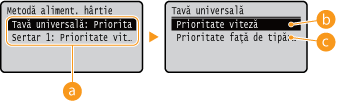Hârtie admisibilă), <Prioritate viteză> se aplică sursei de hârtie. În acest caz, trebuie să încărcaţi hârtia în acelaşi mod ca atunci când selectaţi <Prioritate viteză> (