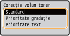 Ajustaţi volumul de toner furnizat, astfel încât să se asigure rezoluţia corespunzătoare pentru text şi linii şi tonul corespunzător al culorii pentru alte tipuri de date imprimate.