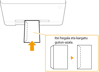 Atal honetan gutun-azalak nahi duzun orientazioarekin nola kargatu behar diren azaltzen da, eta gutun-azalak kargatu baino lehen jarraitu beharreko prozedurak ere bai. Gutun-azalak paper-tiraderan edo eskuz elikatzeko erretenean kargatzeko prozedura orokorraren deskribapen bat jasotzeko, ikusi Papera paper-tiraderan kargatzea edo Papera eskuz elikatzeko erretenean kargatzea.