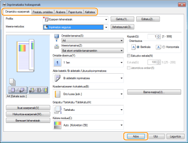 Hautatu makina honetarako inprimagailuaren kontrolatzailea eta sakatu [Preferences] edo [Properties].
