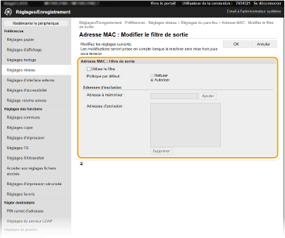 2 | Indiquez les exceptions voulues. Saisissez l'adresse MAC dans la zone de texte [Adresse à mémoriser] et cliquez sur [Ajouter]. Vous n'avez pas besoin de délimiter l'adresse par des tirets ou par deux-points. ![]() Vérification des erreurs de saisie En cas de saisie incorrecte des adresses MAC, vous risquez de pas pouvoir accéder à l'appareil via l'interface utilisateur distante. Si cela se produit, réglez <Filtre d'adresse MAC> sur <Désact.>. <Filtre d'adresse MAC> ![]() Si le filtre de sortie [Refuser] est sélectionné Les paquets de multidiffusion et de diffusion ne peuvent pas être filtrés. Suppression d'une adresse MAC des exceptions Sélectionnez une adresse MAC et cliquez sur [Supprimer]. ![]() | ||||