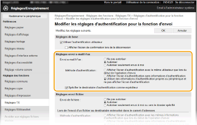 [Ne pas autoriser] | Bloque l'envoi d'e-mails et d'I-Fax. Les options <E-mail> et <I-Fax>, dans la fonction de numérisation, ne peuvent plus être utilisées. |