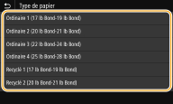 Une fois les paramètres papier par défaut enregistrés, l'écran de définition du papier ne s'affiche plus lorsque vous insérez du papier, et les mêmes paramètres sont appliqués systématiquement. Si vous chargez un papier de format ou de type différents sans modifier les paramètres papier, l'appareil risque de ne pas imprimer correctement. Pour éviter ce problème, sélectionnez <Spécifier lors du chargement du papier> à l'étape 3, puis chargez le papier. |