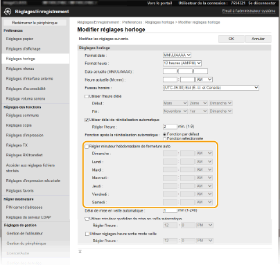 Cochez la case [Régler minuteur hebdomadaire de fermeture auto], puis définissez l'heure de mise hors tension.