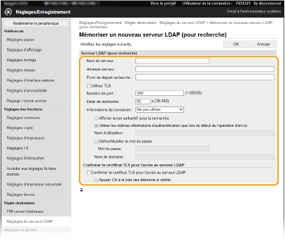 Les serveurs LDAP doivent être enregistrés séparément soit pour la recherche soit pour l'authentification. Pour utiliser un serveur pour la recherche de destinataire de fax et d'e-mails, enregistrez-le pour la recherche, et pour l'utiliser pour l'authentification pour l'envoi d'e-mail ou de fax, enregistrez-le pour l'authentification.