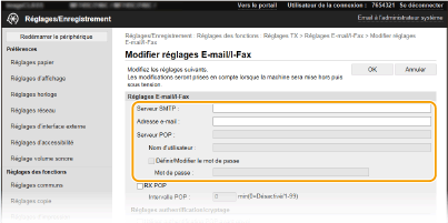 Utilisez l'interface distante pour définir les paramètres détaillés d'envoi et de réception, notamment les paramètres d'utilisation de l'appareil pour l'envoi et la réception des I-Fax et les paramètres d'authentification POP ainsi que le cryptage avant tout envoi d'e-mails ou d'I-Fax. Contactez votre fournisseur ou votre administrateur réseau pour les paramètres requis.