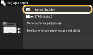 Si vous changez fréquemment de type de papier, vous pouvez sélectionner <Libre>. Cette option réduit le nombre d'étapes nécessaire pour modifier les réglages pour le type de papier à chaque impression. Notez toutefois qu'avec ce réglage l'appareil exécute l'impression même si le type de papier sélectionné dans le pilote d'imprimante diffère de celui du papier chargé dans l'appareil.