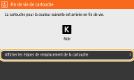 Ce message vous signale qu'une cartouche d'encre doit être bientôt remplacée. Assurez-vous de disposer d'une cartouche de rechange. Remplacez la cartouche de toner si vous voyez ce message avant d'envoyer à l'impression un document volumineux. Ce message s'affiche si <Action en cas d'avertissement> est réglé sur <Arrêter l'impression> (