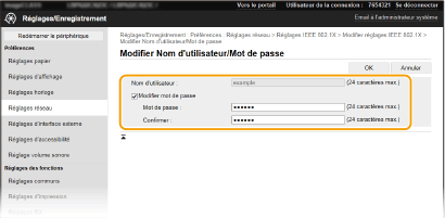 3 | Définissez le nom d'utilisateur/mot de passe. [Nom d'utilisateur] Saisissez le nom d'utilisateur en caractères alphanumériques. [Modifier mot de passe] Pour définir ou modifier le mot de passe, cochez cette case et saisissez un mot de passe en caractères alphanumériques dans les zones de texte [Mot de passe] et [Confirmer]. |