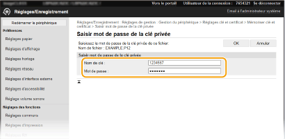 Cliquez sur [Réglages clé et certificat] pour installer une clé avec certificat, ou sur [Réglages certificat CA] pour installer un certificat CA.