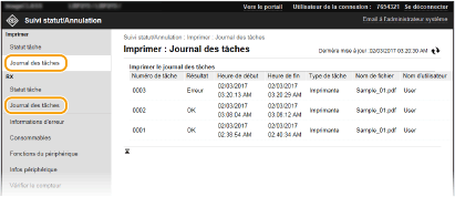 Connectez-vous à l'interface utilisateur distante (Démarrage de l'interface utilisateur distante) [Suivi statut/Annulation] [Journal de cartouche]