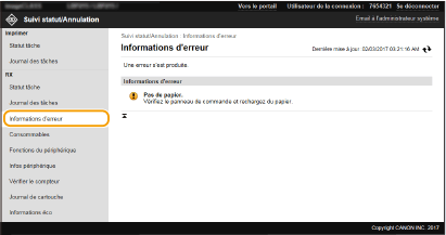 En cas d'erreur, cette page s'affiche lorsque vous cliquez sur le message figurant sous [Informations d'erreur] dans la page de portail (page principale). Écran de l'interface utilisateur distante