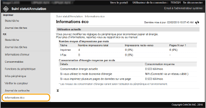 Le volume total mensuel d'impressions et la consommation électrique totale mensuelle sont affichés. Vous pouvez afficher l'écran Informations éco et changer les réglages pour économiser le papier et réduire la consommation électrique.