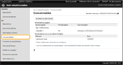Le format et le type de papier de la source ainsi que le numéro de modèle de cartouche de toner, notamment, sont également affichés. Vous pouvez également cliquer sur [Vérifier les détails des consommables], dans la page du portail (page principale) pour afficher cette page (Écran de l'interface utilisateur distante).