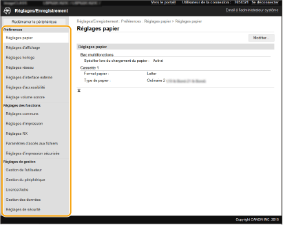 Vous ne pouvez modifier certains réglages que si vous êtes connecté en tant qu'administrateur système.