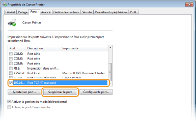 1 | Sélectionnez le numéro de port à supprimer et cliquez sur [Supprimer le port]. ![]() ![]() Vous ne pouvez pas supprimer un port configuré en tant que port de l'imprimante. Pour supprimer ce port, sélectionnez un autre port et cliquez sur [Appliquer] pour le configurer en tant que nouveau port de l'imprimante, puis supprimez le port d'origine. |