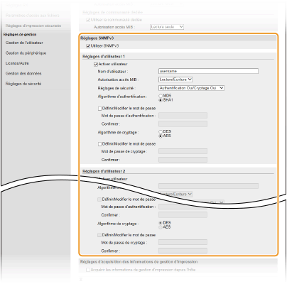 Le protocole SNMP (Simple Network Management Protocol) est un protocole dédié à la surveillance et au contrôle des périphériques de communication d'un réseau et fait intervenir une base d'informations de gestion MIB (Management Information Base). L'appareil prend en charge la version SNMPv1 ainsi que la version SNMPv3 dotée de fonctions avancées de sécurité. Vous pouvez vérifier le statut de l'appareil à partir d'un ordinateur lorsque vous imprimez des documents ou utilisez l'interface utilisateur distante. Vous êtes libre d'activer SNMPv1, SNMPv3 ou encore les deux protocoles à la fois. Indiquez les réglages de chaque version de façon à les adapter à votre environnement réseau et à l'utilisation du réseau.